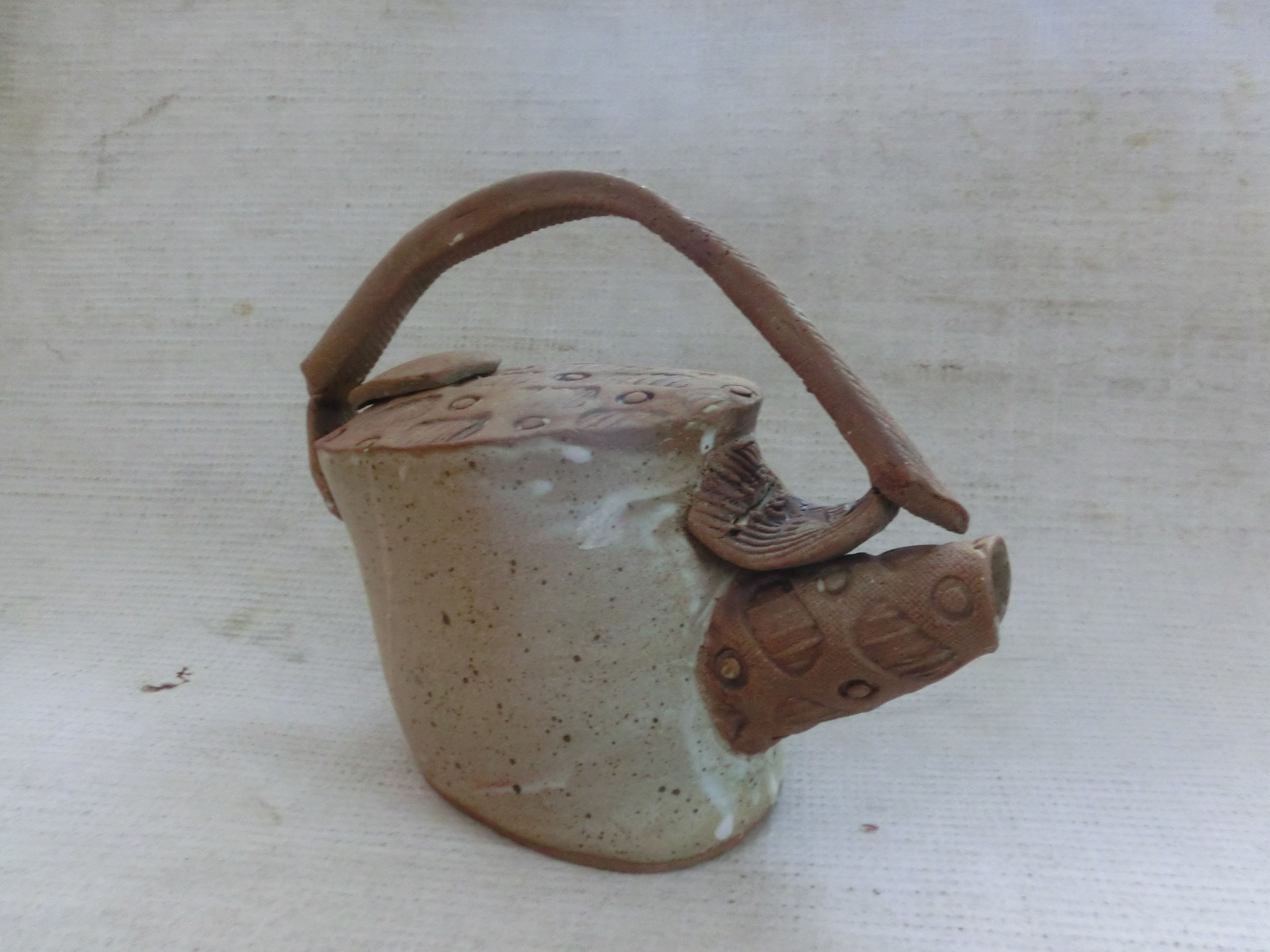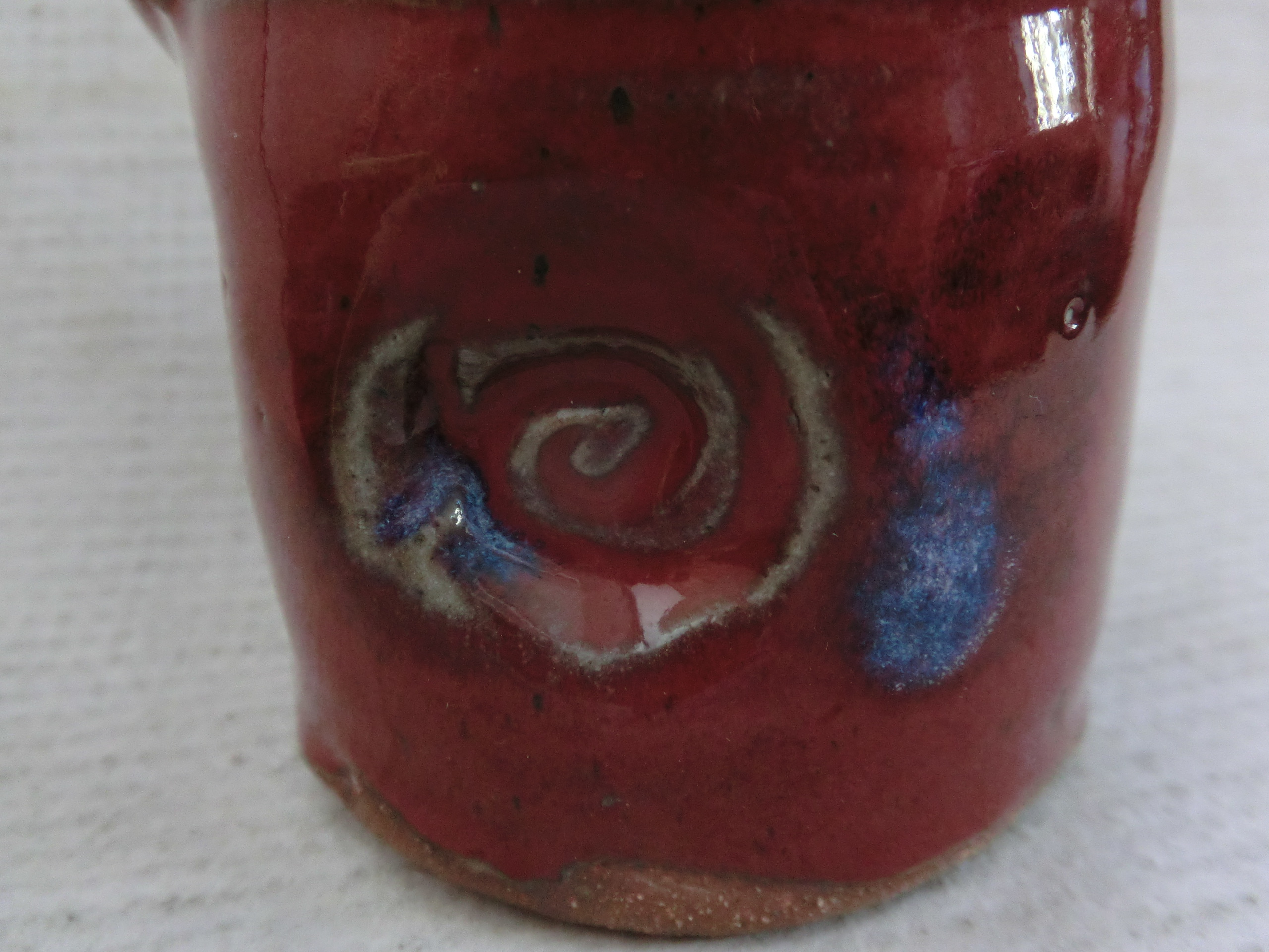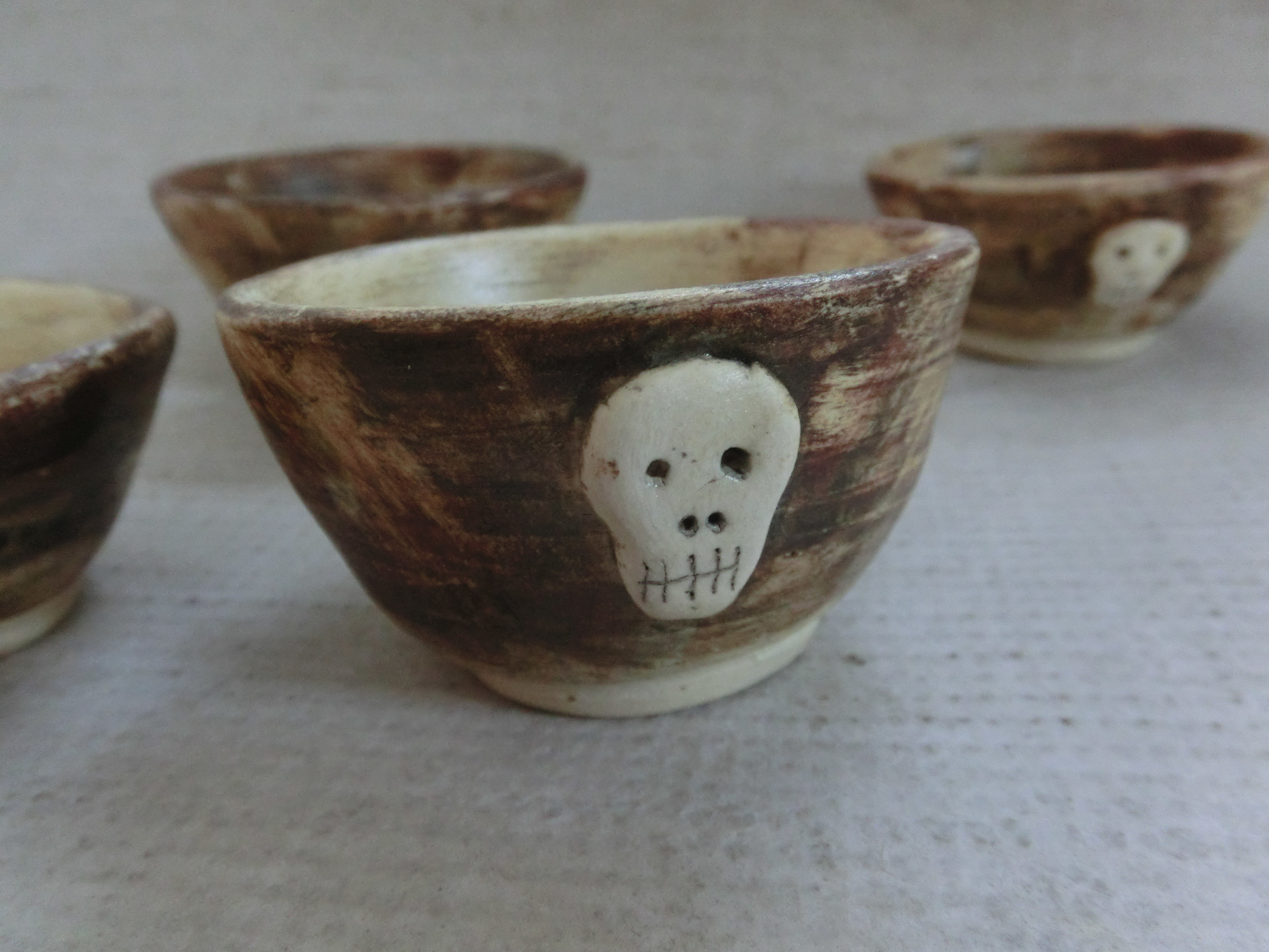 A year has passed since we were in the wonderful artsy, historic, spiritual center of Oaxaca in southern Mexico, on the verge of the explosion of living and dead humanity that is Dia de los Muertos. These sorry little pots are the result of 1) a worthless kickwheel, 2) bad untested glazes applied by brush 3) poor firing in an unknown kiln.