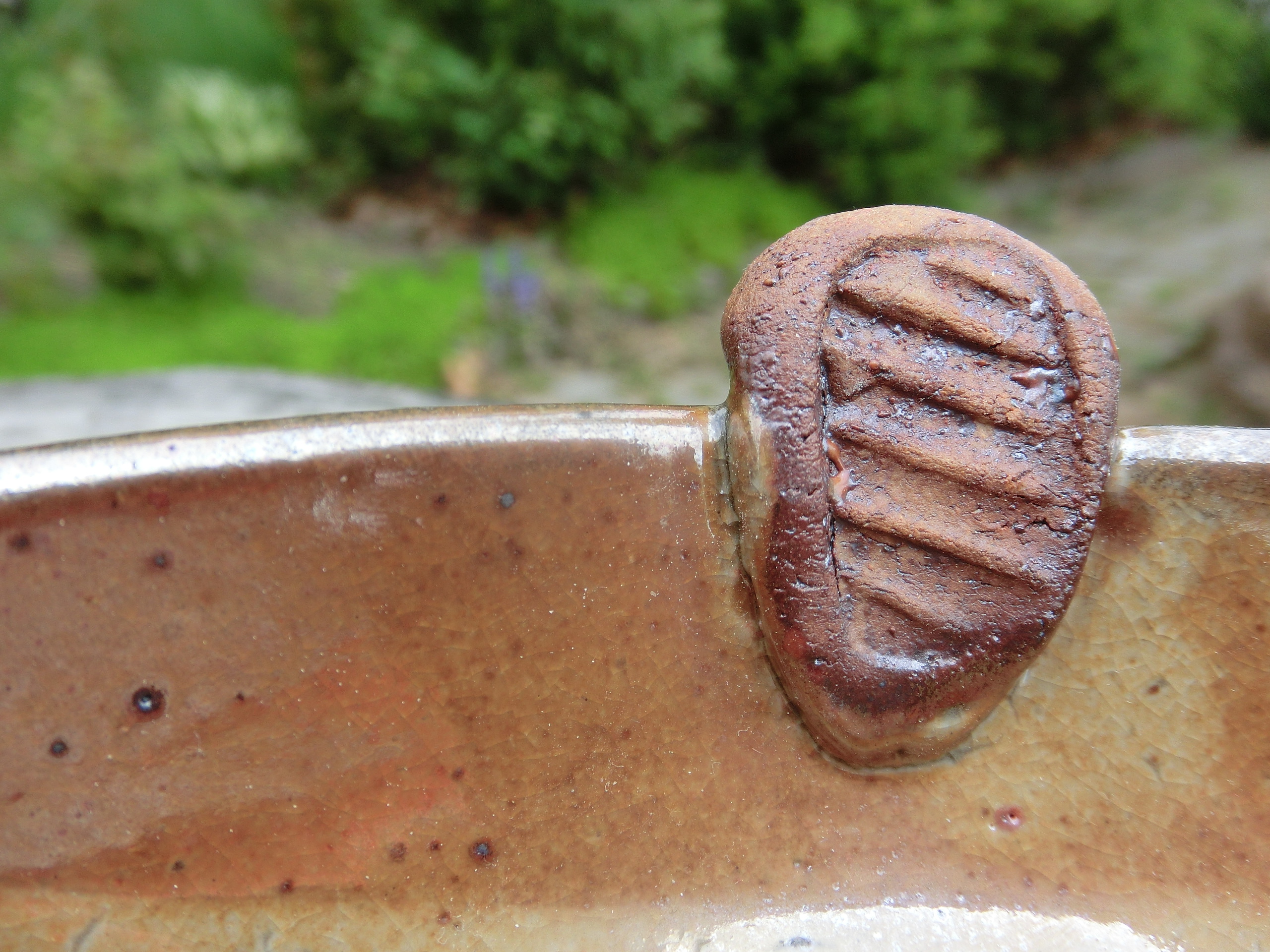 This serving platter is about nine inches across, and is in a favorite glaze, Malcolm’s shino. It will be among items on sale tomorrow at Off the Beaten Track, 2414 Douglas St. NE in Washington DC.
